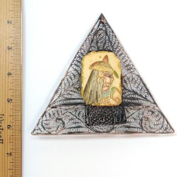 Metal stand with the Egyptian Pharoh’s head hand painted on resin and mouted on a metal frame. For the desk or displayed as a work of art!