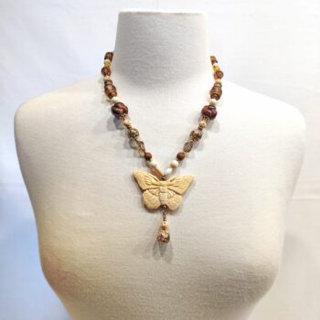Fancy Jasper & Cloisonne Necklace w/Hand Carved Butterfly Pendant22″