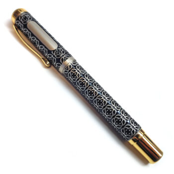 geometric patterns in black on brushed silver roller ball pen. There is place on the cap for you to etch a name .